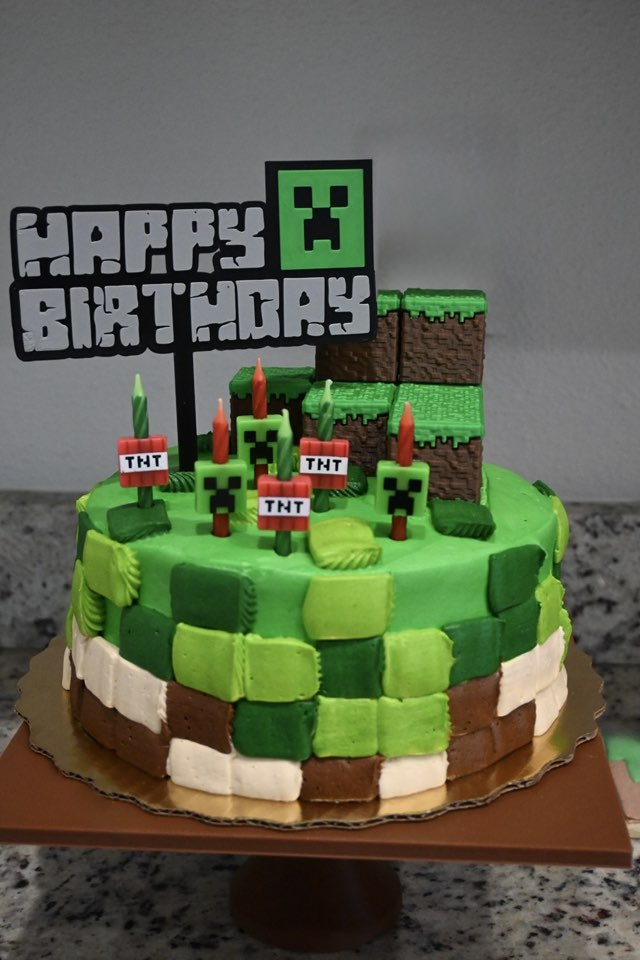 These images showcase an exciting Minecraft-themed birthday celebration. One photo features an interactive backdrop with large pixelated blocks, along with balloon decorations in green and black to represent the Minecraft world. Another image shows a detailed Minecraft birthday cake, designed like a Creeper’s face with TNT and blocks surrounding it.