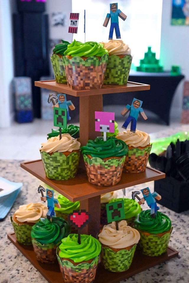 There are also cupcakes arranged in a Minecraft style, decorated with pixelated characters. The table is filled with treats in green trays, along with creative Minecraft figurines, giving the party a fun, immersive vibe.
