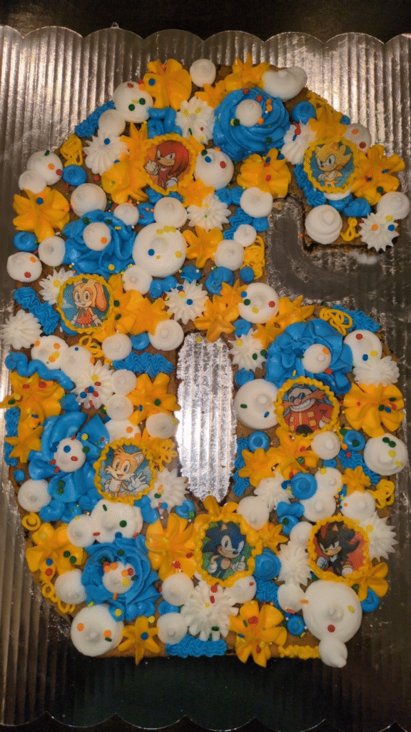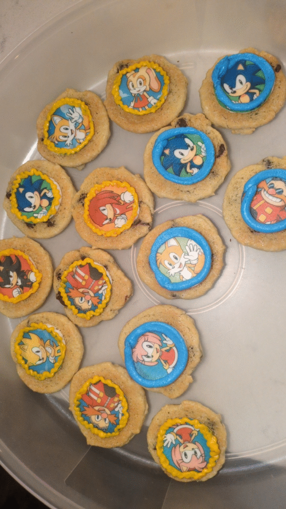 The images showcase a lively Sonic-themed birthday celebration. One features a large, number-shaped Sonic cake decorated with blue, yellow, and white icing, topped with iconic Sonic characters like Knuckles, Tails, and Eggman. Another captures a tray of cookies adorned with colorful Sonic character images.