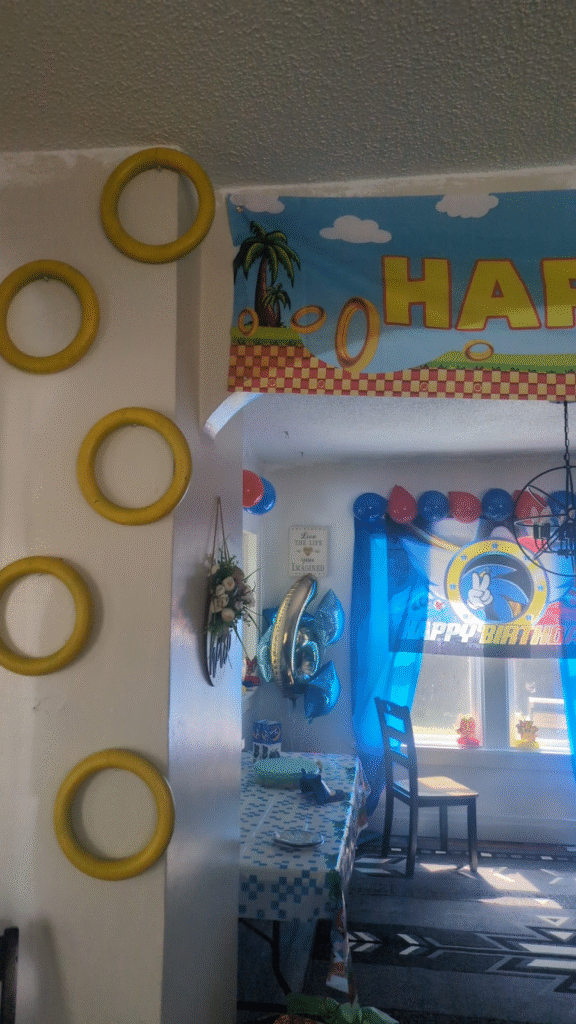 A festive corner is filled with blue and gold balloons, complemented by a Sonic-themed piñata. The final image presents a party banner with Sonic rings and bright, colorful decorations, creating a vibrant atmosphere for the celebration.