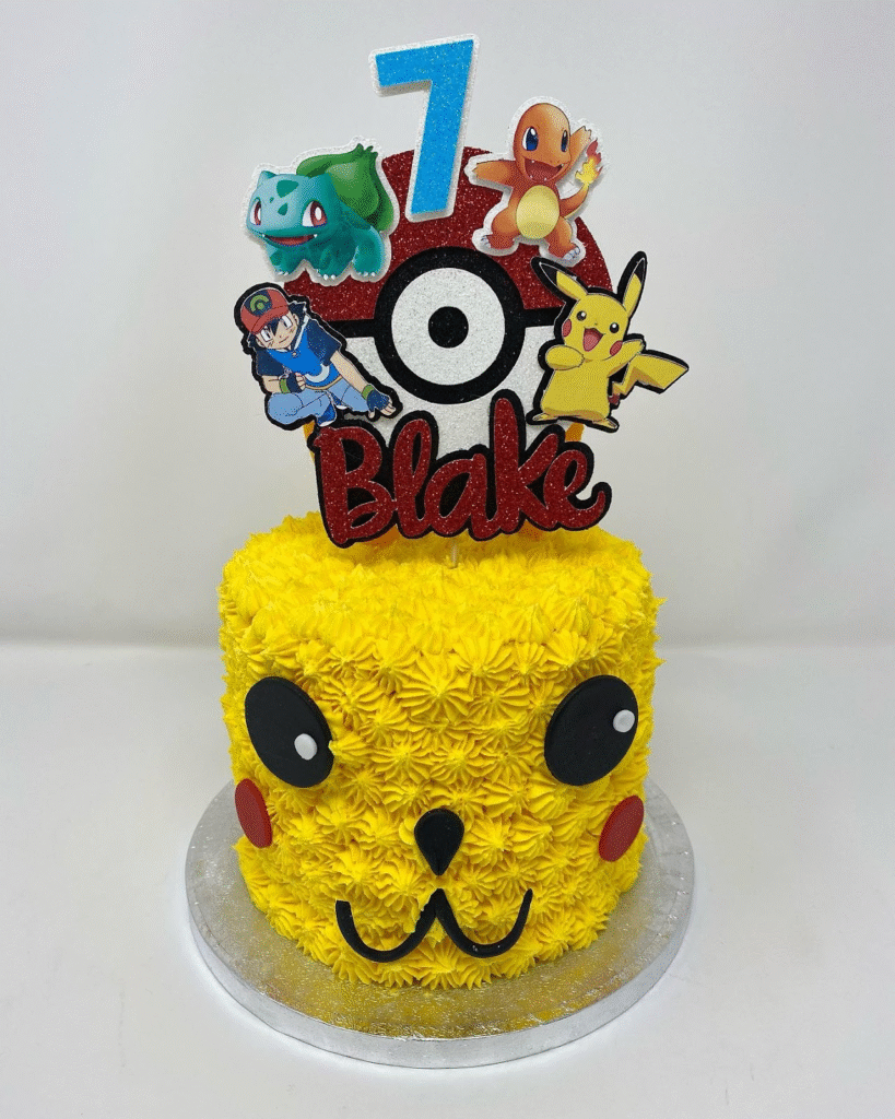 What Makes This Image Stand Out: Bright Pikachu design, textured frosting, and iconic Pokémon characters create a fun, energetic centerpiece for a Pokémon lover’s dream party.