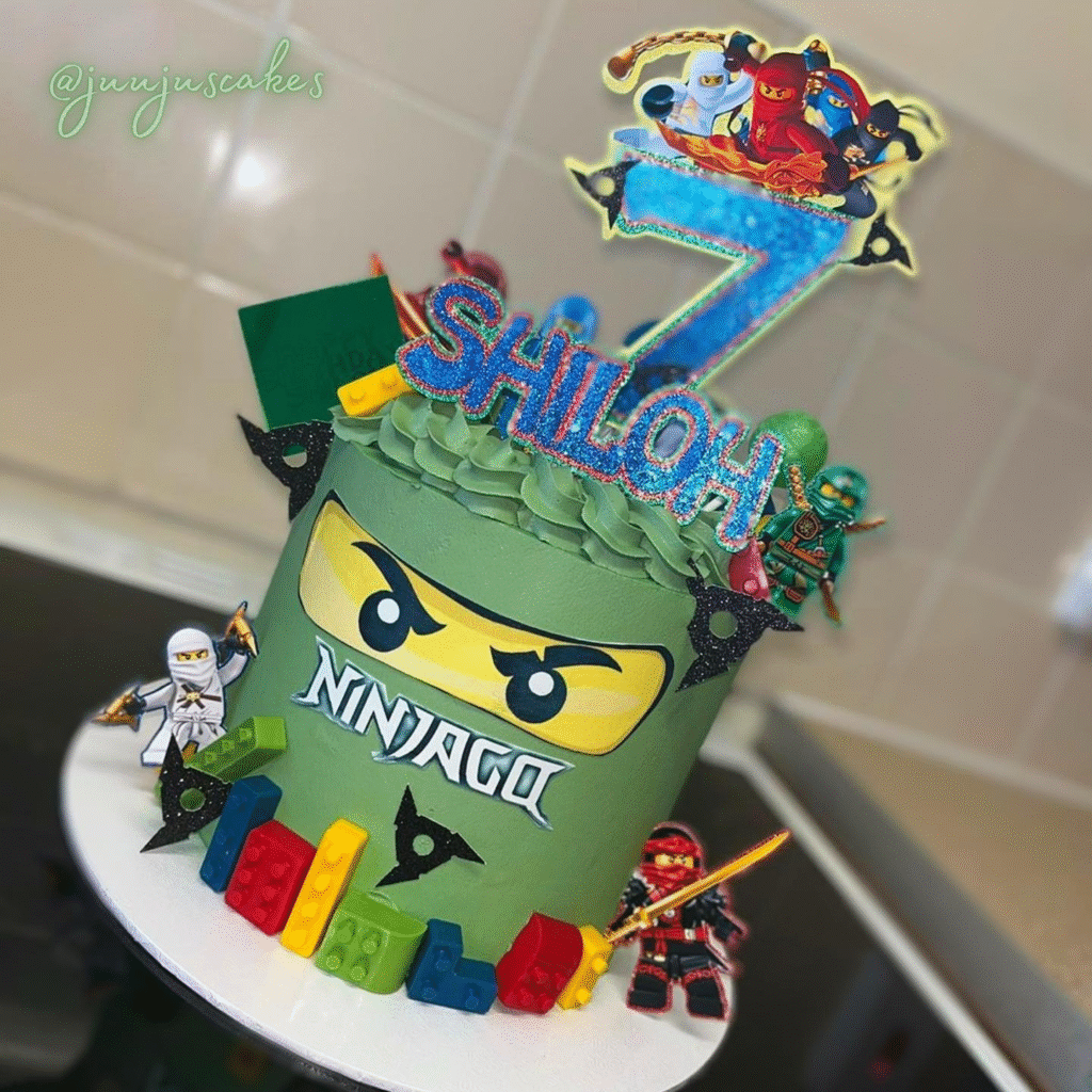 What Makes This Image Stand Out: Vivid green design, bold character details, and vibrant ninja decorations make this cake an energetic centerpiece for a Ninjago fan’s celebration.