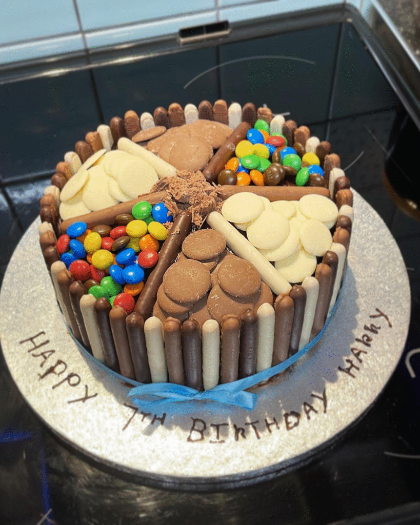 Layers of joy and color burst from this chocolate-loaded birthday cake. Divided into delicious sections of M&Ms, white chocolate buttons, biscuits, and milk chocolate treats, it’s a candy lover’s paradise that delights both the eyes and the taste buds.