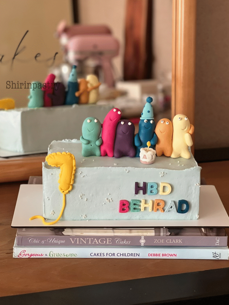 A cheerful display of fun and imagination, this birthday cake bursts with color and joy. Decorated with adorable fondant figures in bright shades of teal, red, purple, and orange, it perfectly captures the magic of childhood celebrations.
