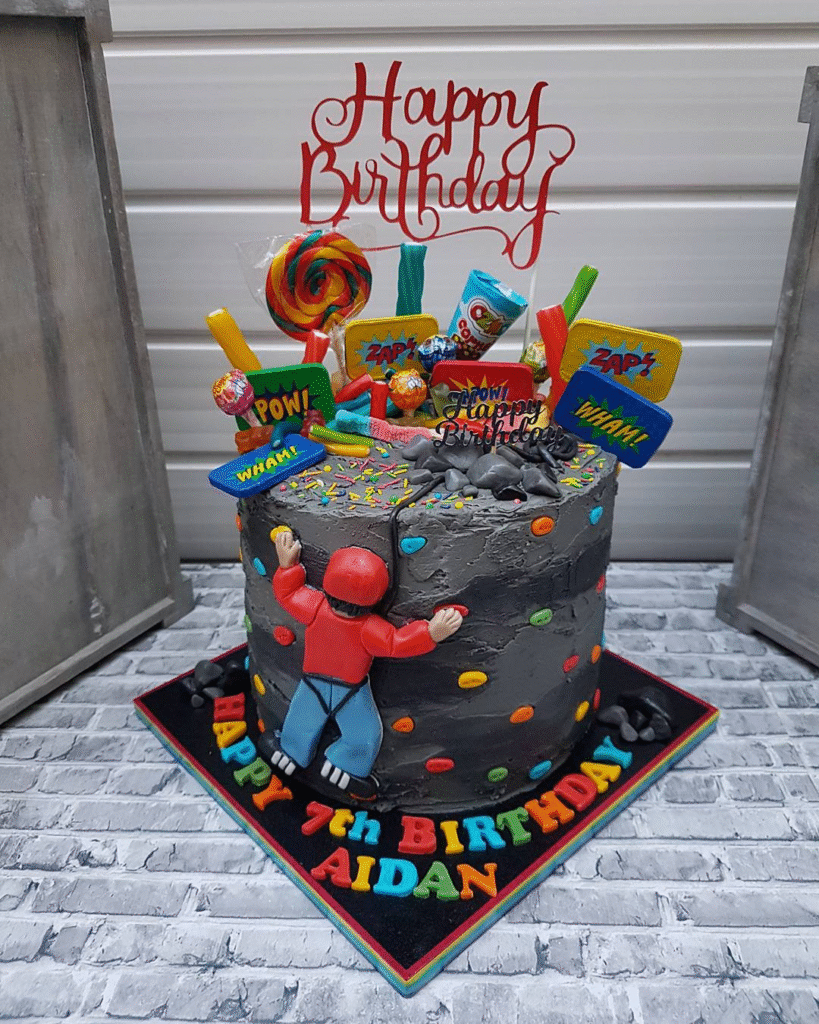 Bold and exciting, this adventure-themed birthday cake celebrates energy and imagination. A fondant figure of a climber scales a textured gray rock wall, surrounded by bright candy “rocks” and playful comic-style toppers that shout “POW!” and “ZAP!” in vivid bursts of color.