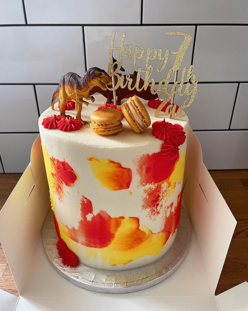 Bright splashes of orange, yellow, and red frosting bring this dinosaur-themed cake to life, creating a fiery, volcanic effect that perfectly suits a prehistoric adventure. The design feels bold and exciting, setting the stage for a fun celebration.