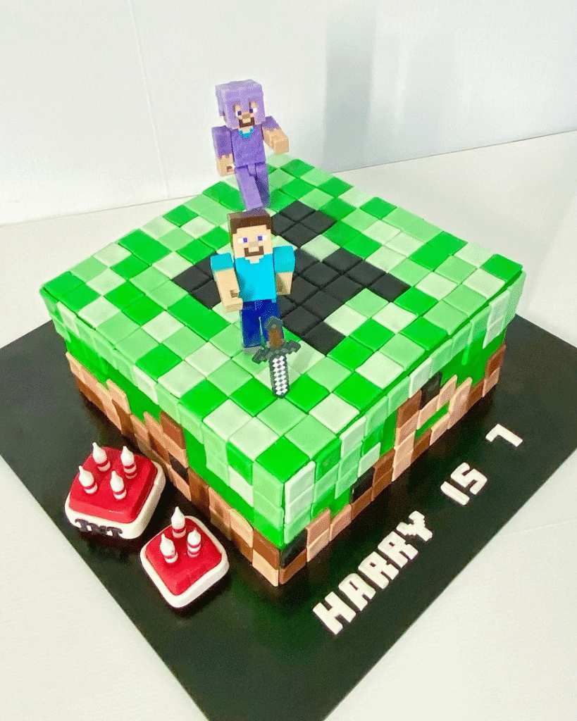Vivid green, brown, and black fondant squares recreate the unmistakable Minecraft world, making this cake a true gamer’s dream. Every pixel-like block perfectly mimics the game’s terrain, bringing the fun and creativity of Minecraft to life.