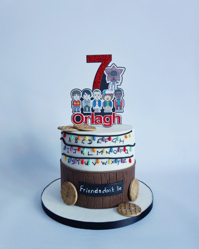 A glittering red “7” topper, the birthday name “Orlagh,” and adorable cartoon versions of the show’s main characters make it uniquely personal. The fondant cookies and the “Friends don’t lie” message tie the theme together perfectly, equal parts spooky and sweet!