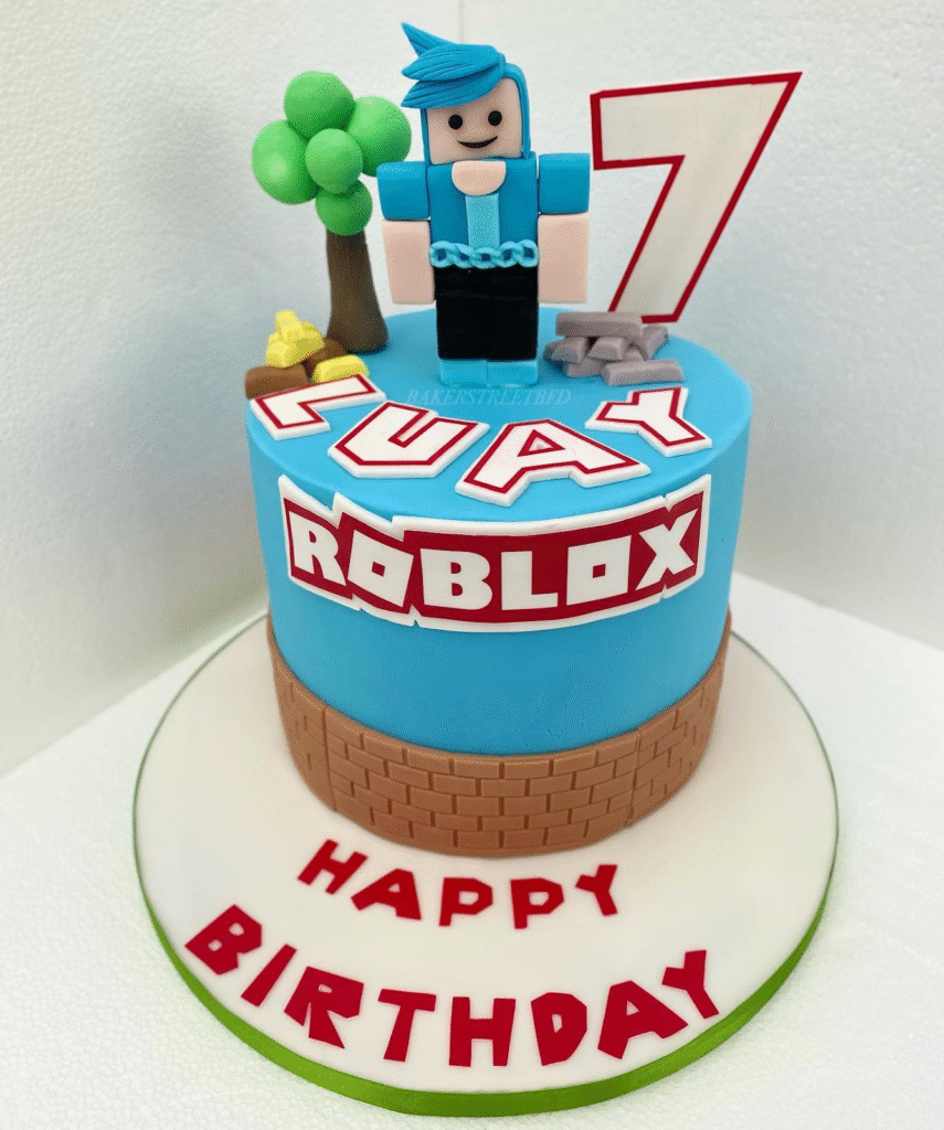 Cool blue tones and bold red lettering bring this Roblox-themed cake to life, capturing the excitement of the virtual gaming world. A fondant Roblox character stands proudly atop the cake, surrounded by fun details like a tree, rocks, and golden blocks.