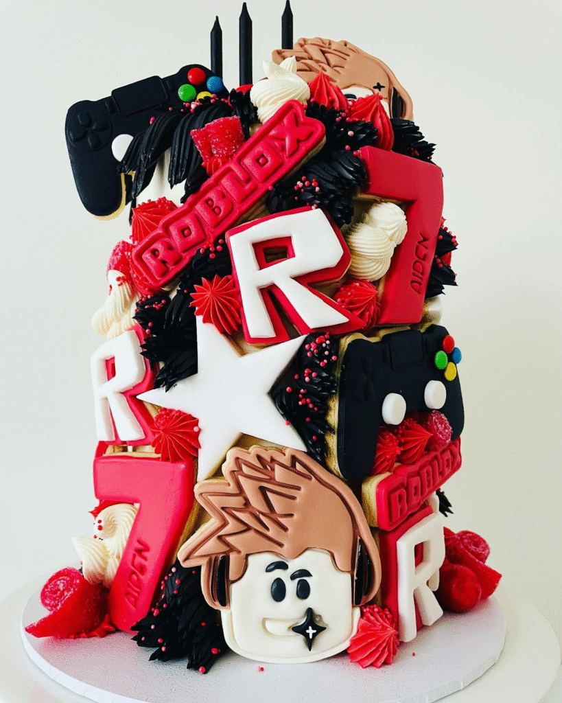 Exploding with color and creativity, this Roblox-themed birthday cake celebrates gaming excitement in every layer. Red, black, and white frosting swirl together with bold fondant letters, stars, and gaming controllers, creating a vibrant visual treat for any young gamer’s big day.