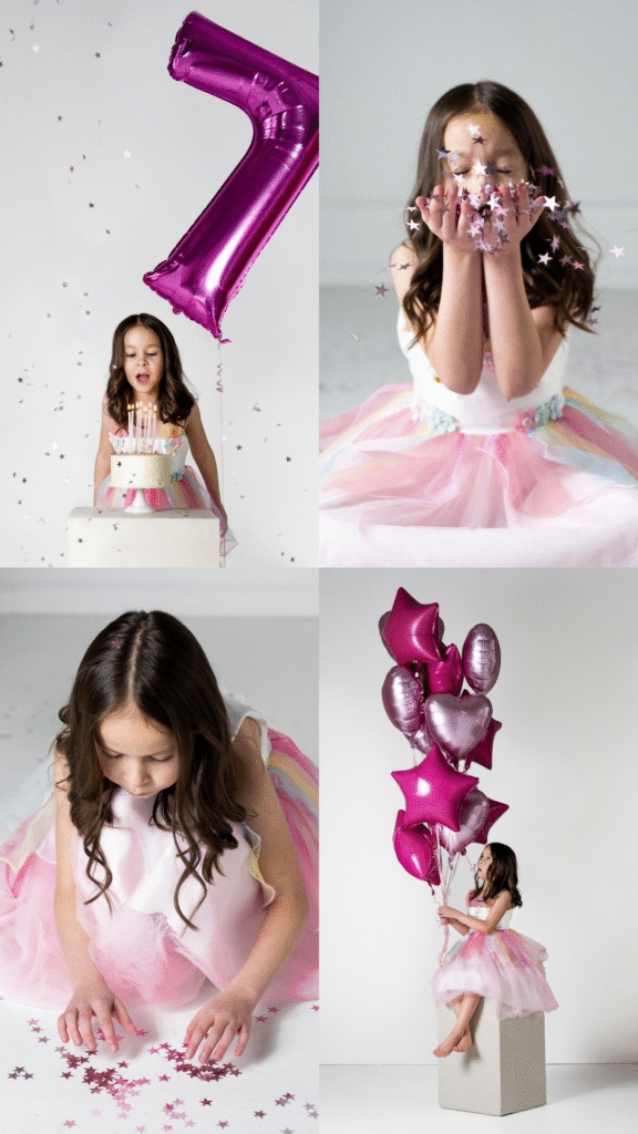 From bohemian garden fairy themes to artistic “create your own magic” setups, we’ve prepared 12 elegant photoshoot ideas that reflect her individuality. Let’s make her seventh year unforgettable!