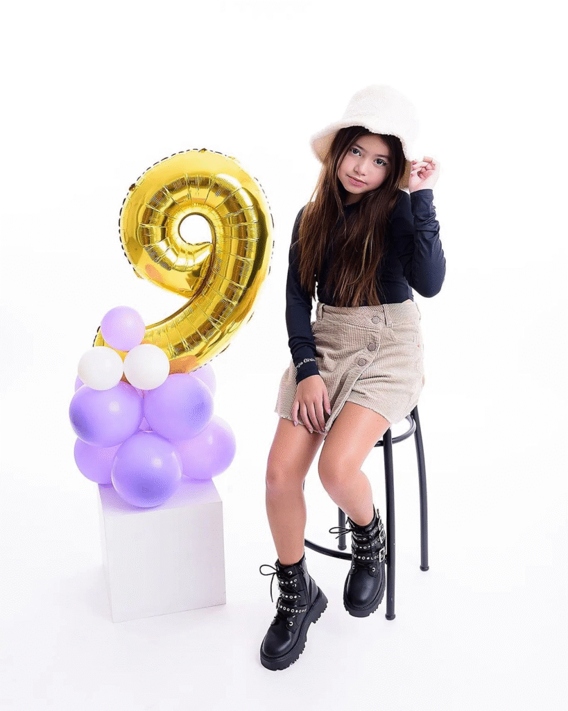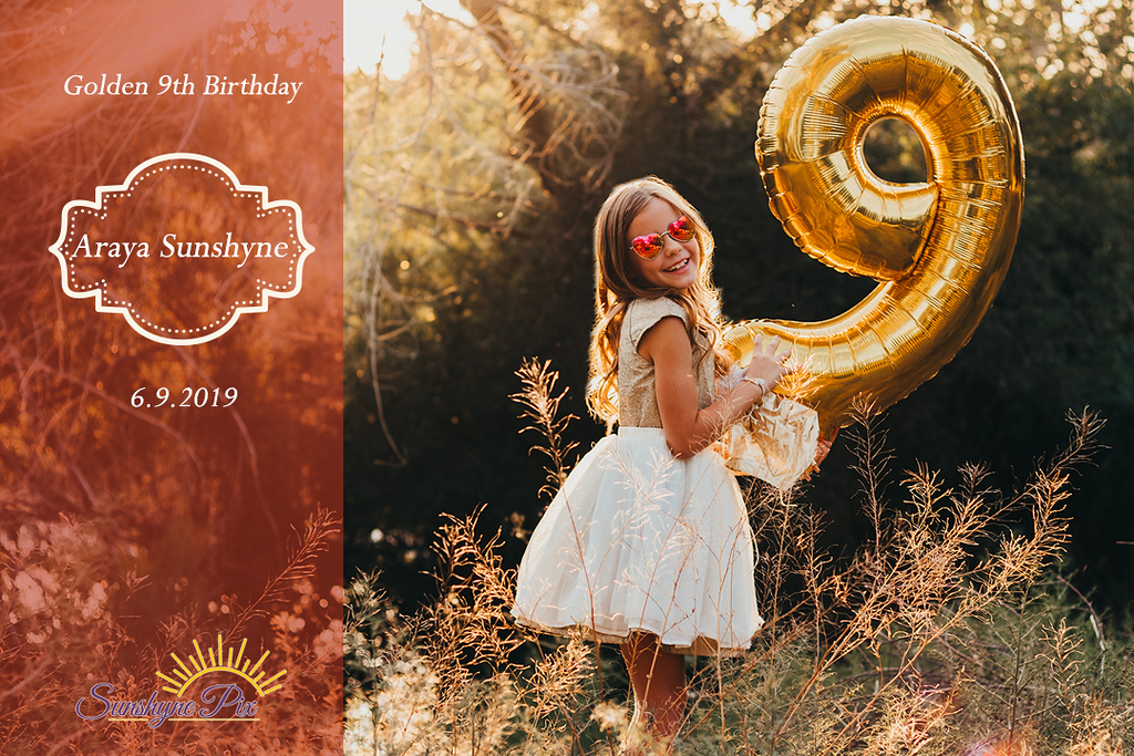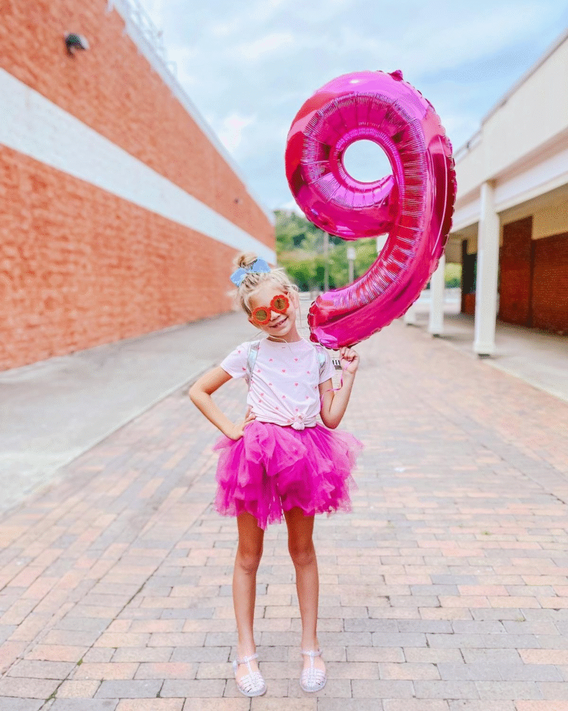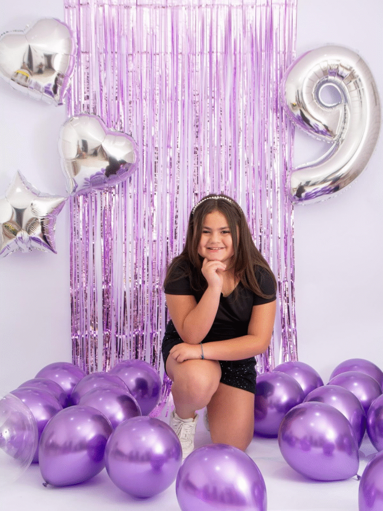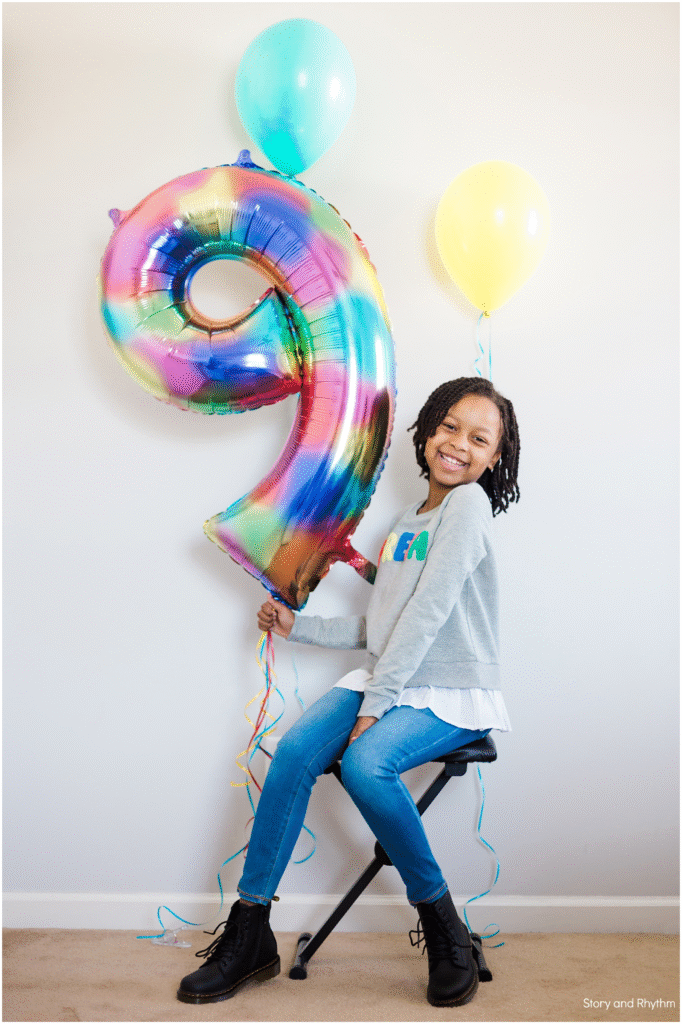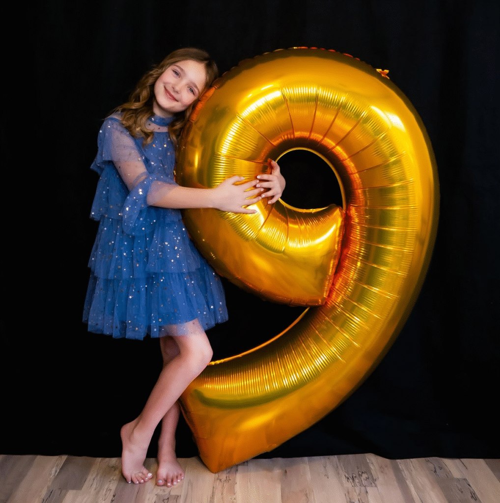 This concept marks 9th birthday girls with balloons, props, or signage.