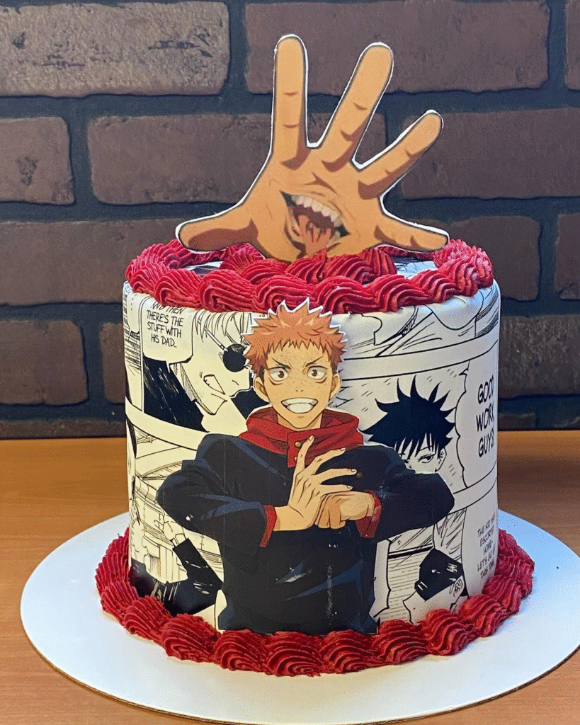 What Makes This Image Stand Out: Comic-style manga wrap, bold character pop-outs, and Sukuna’s eerie hand topper make this a visually intense anime cake.