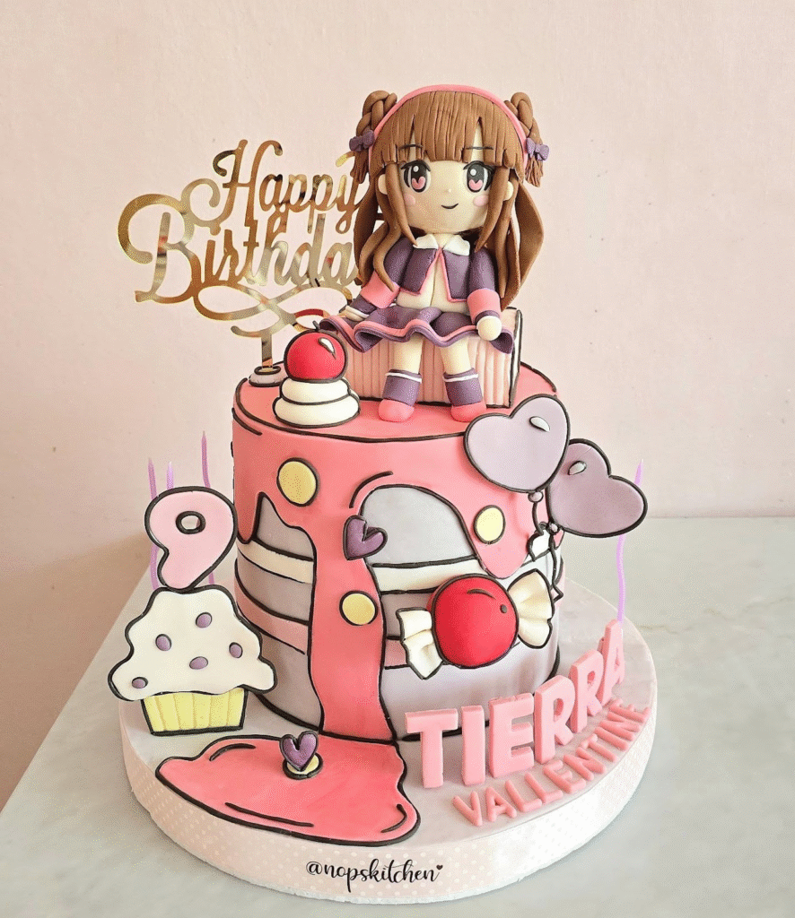 Overflowing with charm, this pastel-pink birthday cake features a handcrafted chibi girl figurine dressed in a cute school-style outfit, seated gracefully atop a drippy candy-layered design. Heart balloons, cupcakes, lollipops, and playful dots bring the entire dessert to life, creating a whimsical anime-inspired world for Tierra Valentine’s 9th birthday.