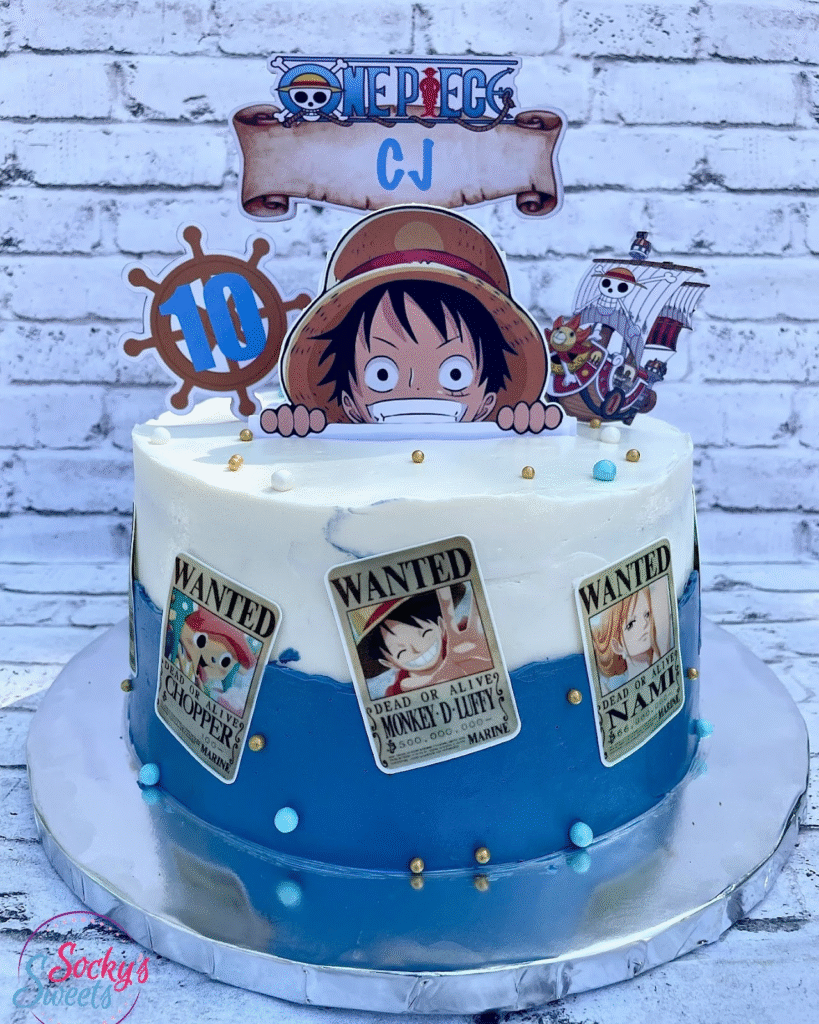 Inspired by the high seas of the Grand Line, this One Piece birthday cake captures pirate spirit with wanted posters of Luffy, Chopper, and Nami circling the base. The frosting is split between ocean blue and creamy white, mimicking waves meeting the sky.