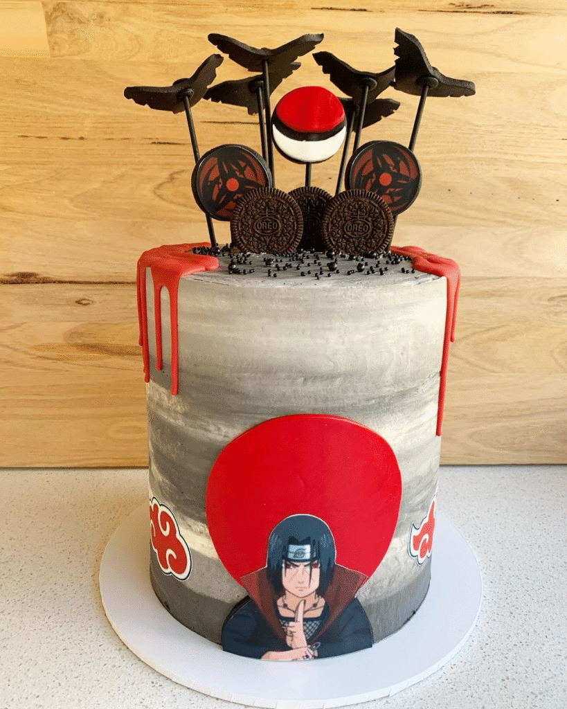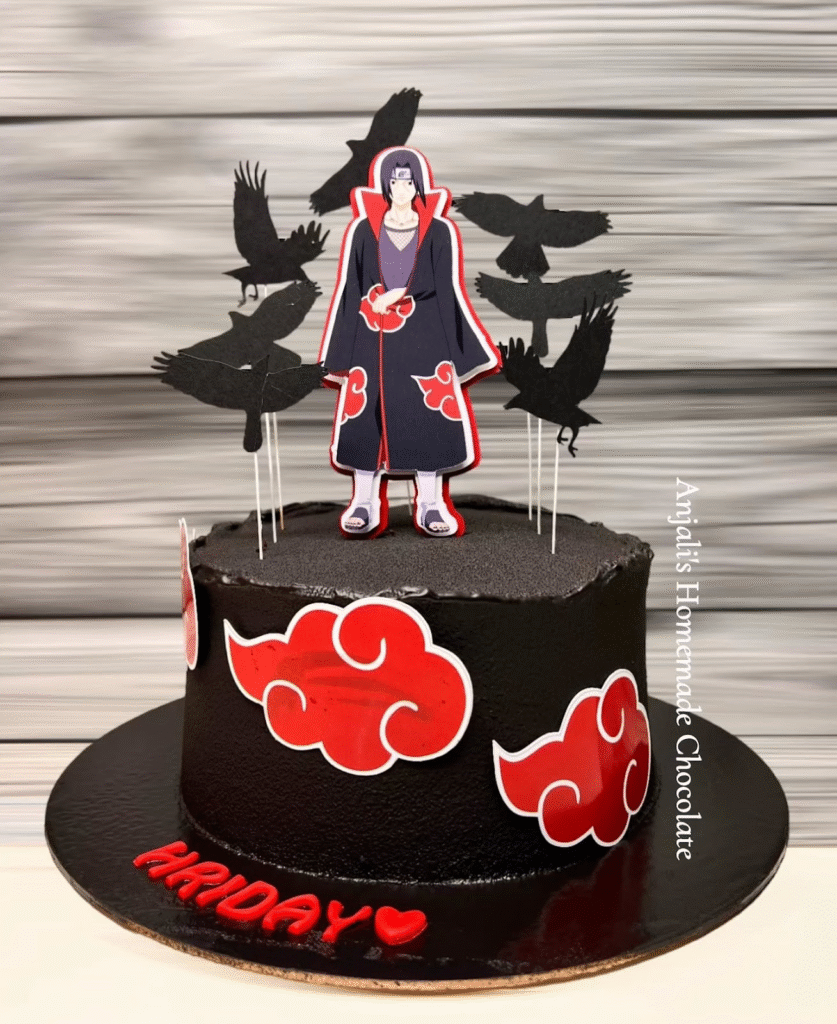 Drenched in midnight black with vivid red Akatsuki clouds, this powerful cake pays tribute to Itachi Uchiha’s iconic legacy. A cutout of the legendary rogue ninja stands tall at the center, surrounded by dramatic silhouettes of black crows, symbolic of his genjutsu and mysterious aura.
