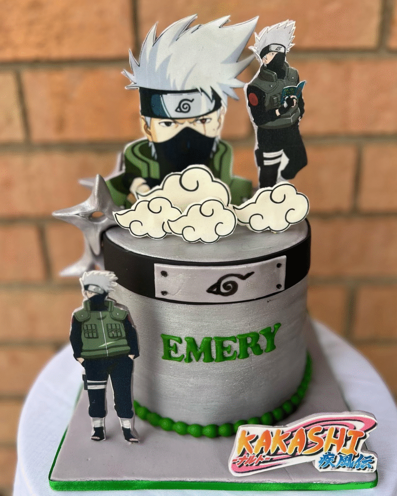 The name “EMERY” is highlighted in green, standing proudly across the front. Black fondant accents and shuriken blades reinforce the stealth theme. From the stylized leaf symbol to the anime logo badge, every detail honors Kakashi’s cool, composed persona in true shinobi style.