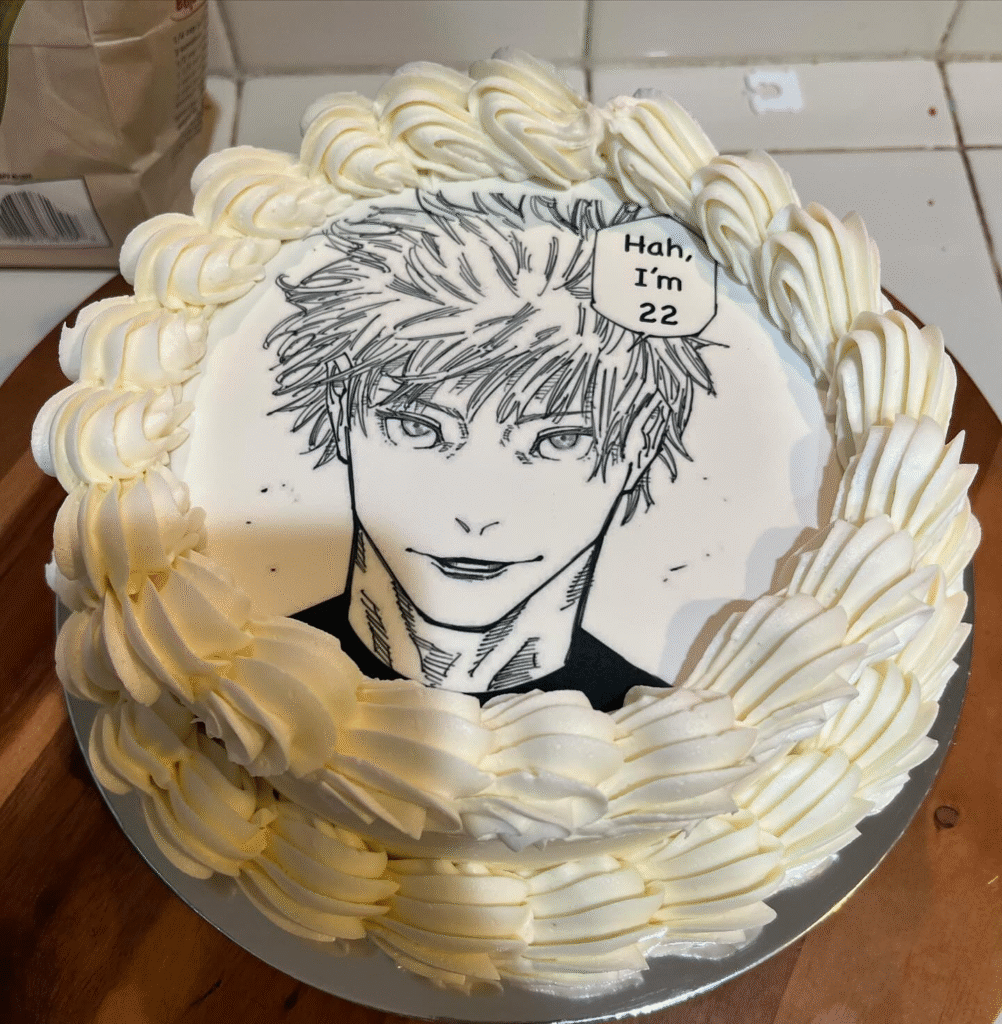 Packed with cursed energy, this striking cake features manga panels from Jujutsu Kaisen wrapped around the sides with intense black-and-white detail. Yuji Itadori’s vibrant cut-out adds a splash of color and power to the scene, standing boldly against the backdrop of action-packed frames.