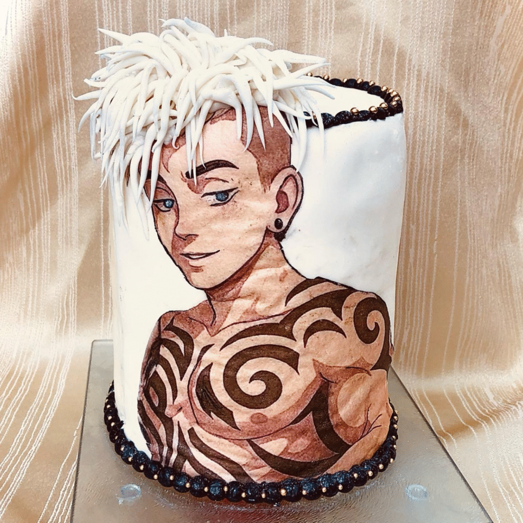 Boldly styled with attitude, this cake features a striking anime character decorated with intricate tribal tattoos across a sculpted torso. Sharp detailing brings the artwork to life, while a cascade of edible spiked white fondant hair creates a dramatic 3D effect.