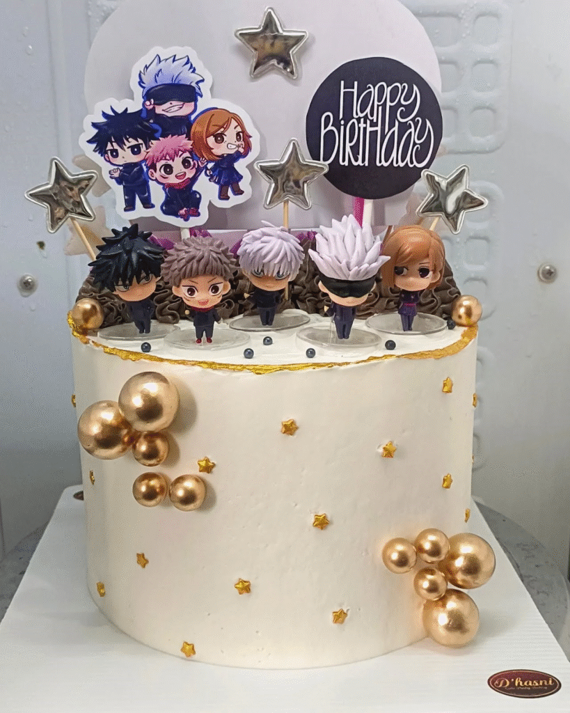 Gleaming golden orbs and scattered mini stars decorate the white frosting base, giving it a celestial, celebratory feel. With detailed figurines and anime styling, the design blends minimalist elegance with the fierce spirit of Jujutsu High’s bravest. A true treat for anime lovers of all ages.