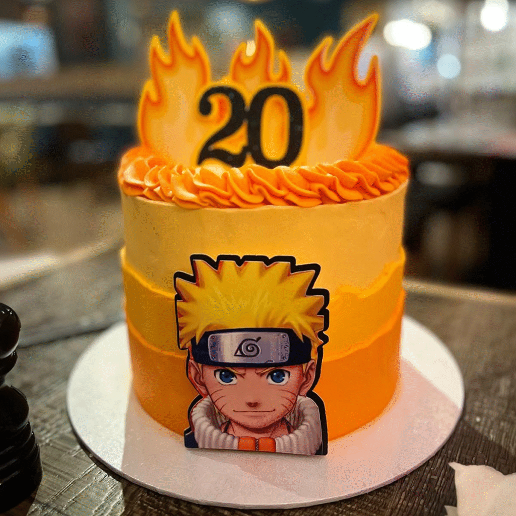 Blazing with bold energy, this vibrant birthday cake pays tribute to Naruto Uzumaki in true shinobi style. Layers of golden-orange frosting evoke his iconic jumpsuit, while fiery fondant flames rise from the top, crowned by a bold black “20.”