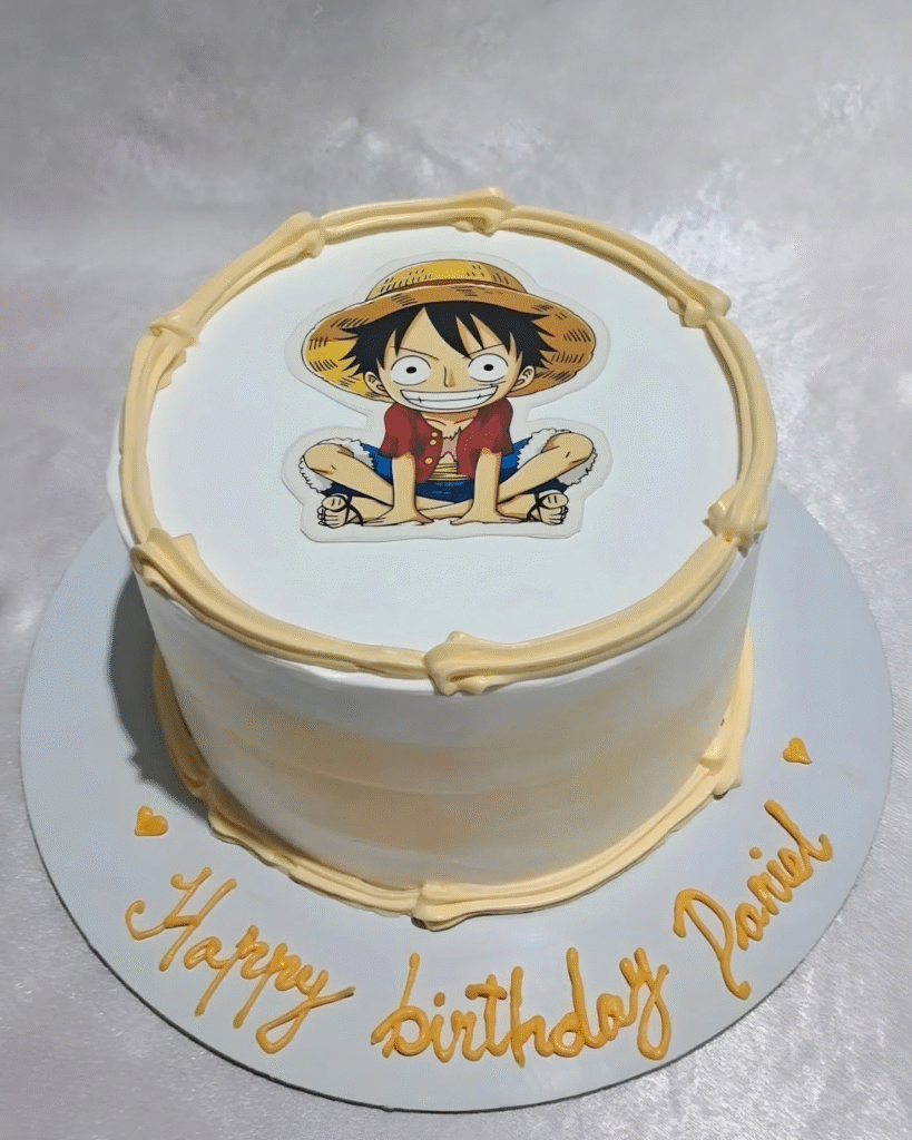 “Happy birthday, Daniel” is piped neatly around the base, bringing warmth and personal touch. With smooth edges and subtle color blending, the cake combines anime fun with a timeless, classic presentation—ideal for fans who appreciate the joy of Luffy’s earliest adventures.