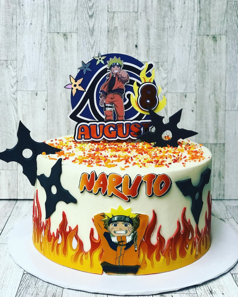 What Makes This Image Stand Out: Striking fire-themed elements, bold colors, and Naruto’s iconic look create a high-energy cake perfect for milestone celebrations.