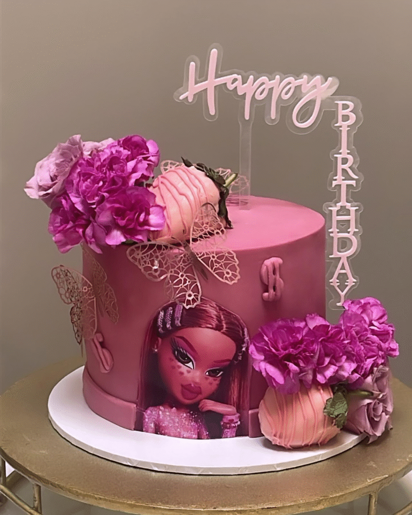 What Makes This Image Stand Out: The cake stands out with its perfect blend of glam and whimsy, featuring a Bratz doll design, floral accents, and a chic “Happy Birthday” topper.