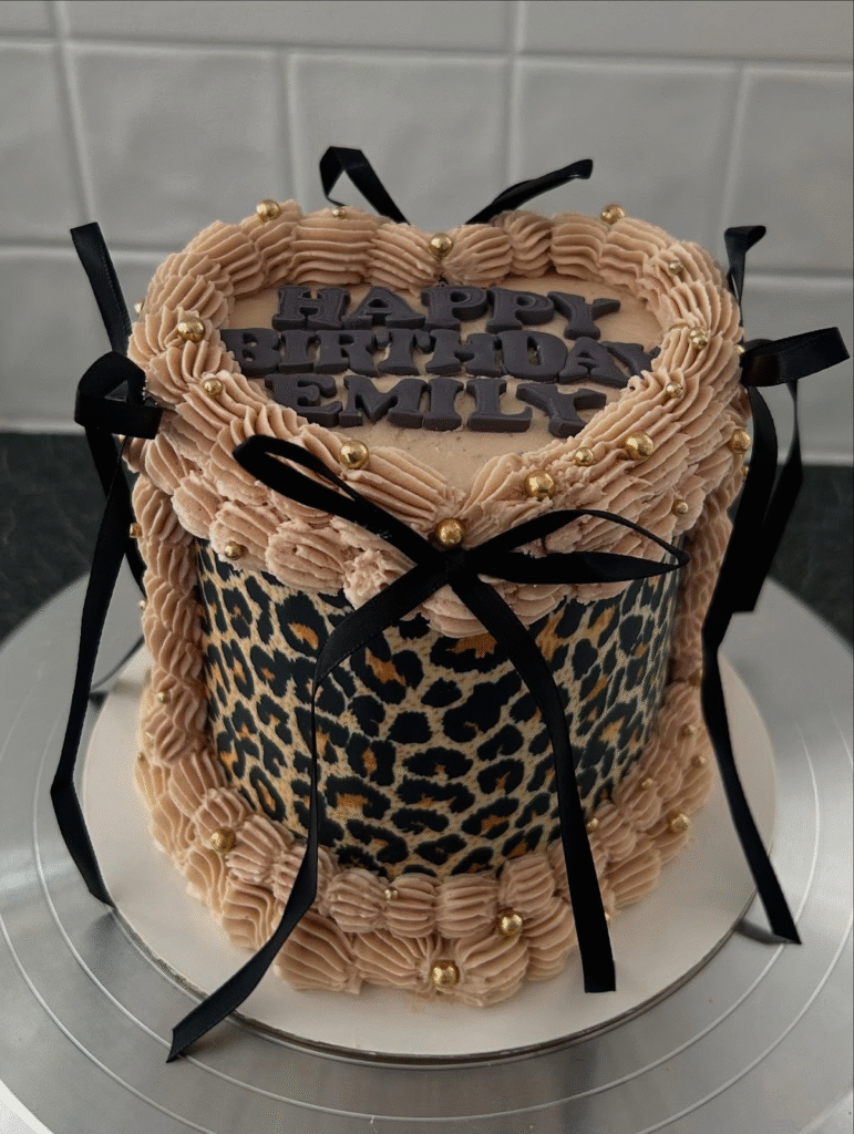 Black satin ribbons are tied elegantly around the cake’s edges, further elevating its sophisticated look. The combination of bold leopard print, personalized design, and classic black ribbons makes this cake an eye-catching and unforgettable centerpiece for any celebration.
