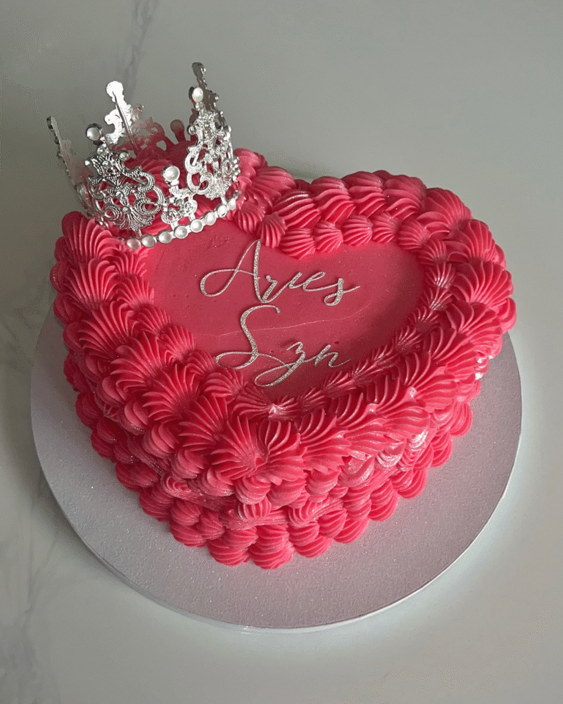 This exquisite heart-shaped cake features a rich pink frosting adorned with delicate rosette details. A top it rests a sparkling silver crown, making it the perfect dessert for a princess-themed celebration. The crown’s intricate design, paired with the soft pink tones, exudes a royal charm, making this cake a standout choice for someone special.