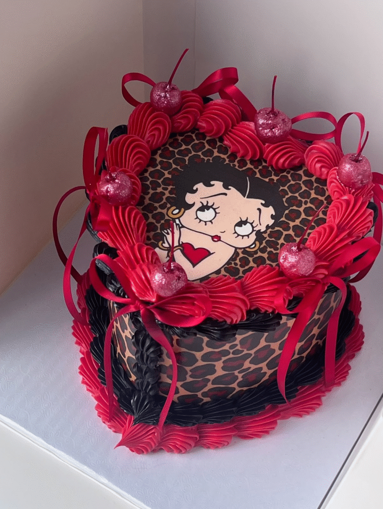 What Makes This Image Stand Out: This birthday cake stands out with its playful Betty Boop theme and vibrant red, black, and leopard print color scheme.