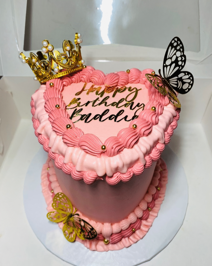 This delightful heart-shaped cake is adorned with pink buttercream, creating a soft and inviting appearance. The cake features a golden crown on top, adding a touch of royalty, while the words “Happy Birthday Baddie” are elegantly written in golden lettering, making it a perfect choice for a glamorous birthday celebration.