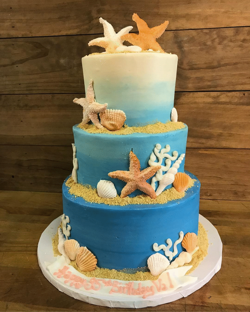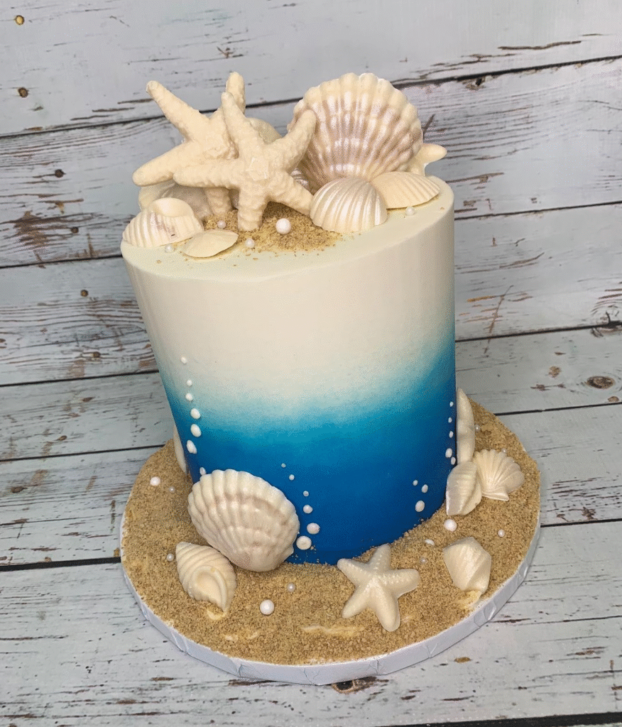 This beautiful beach-themed cake features two tiers with a soft gradient of blue, representing the ocean’s calming waves. Adorned with realistic starfish, seashells, and edible sand, it captures the essence of a serene beach vacation.