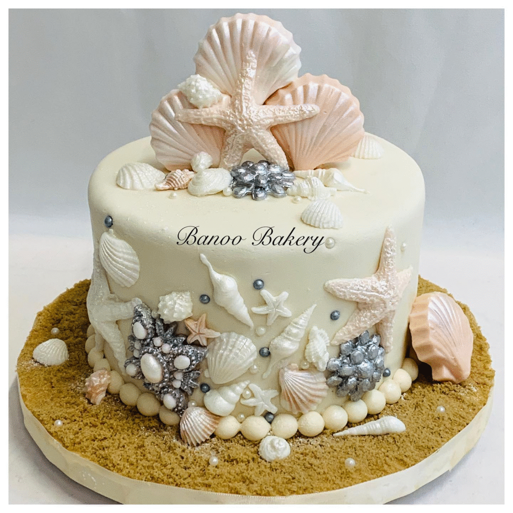 This beautifully crafted cake features a smooth ivory frosting adorned with a collection of intricately placed seashells, starfish, and pearl details. The golden sand effect around the base adds a realistic beach vibe, making it perfect for a coastal celebration.