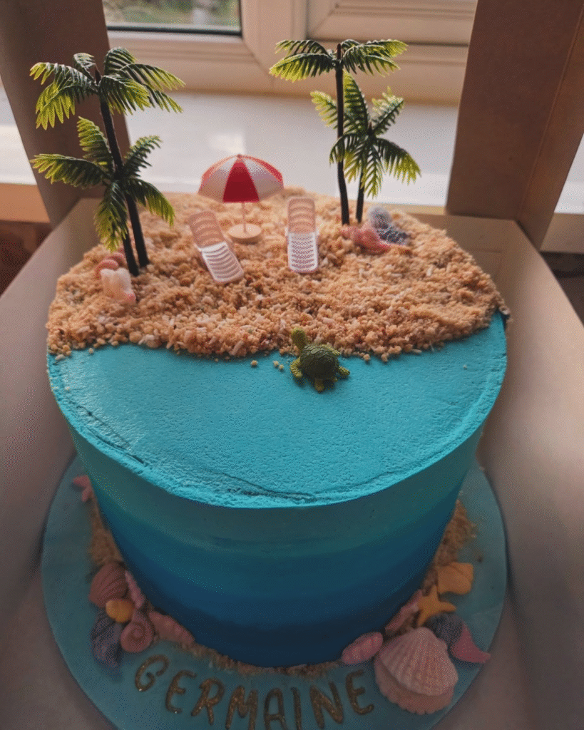 The colorful, beach-inspired details, combined with the personalized “Germaine” name in edible glitter, create a unique and exciting birthday cake that’s perfect for a fun celebration with a tropical theme.