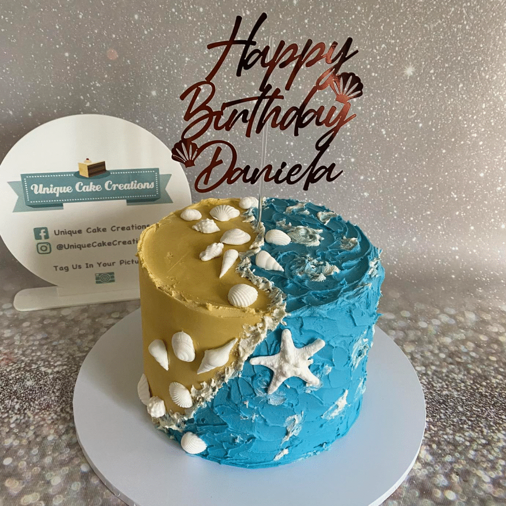 This beach-inspired birthday cake features a split design, with one side in golden yellow and the other in ocean blue, representing the perfect coastal vibe. Topped with seashells and a starfish, it’s a playful and elegant cake for any beach-themed celebration.