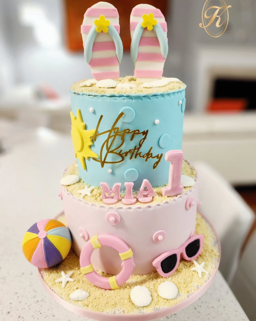 The playful beach vibe is captured with edible sand, adding a realistic touch to the decorations. The “Happy Birthday” topper and the personalized “MIA 1” letters make this cake both fun and meaningful, ideal for celebrating a child’s first birthday.