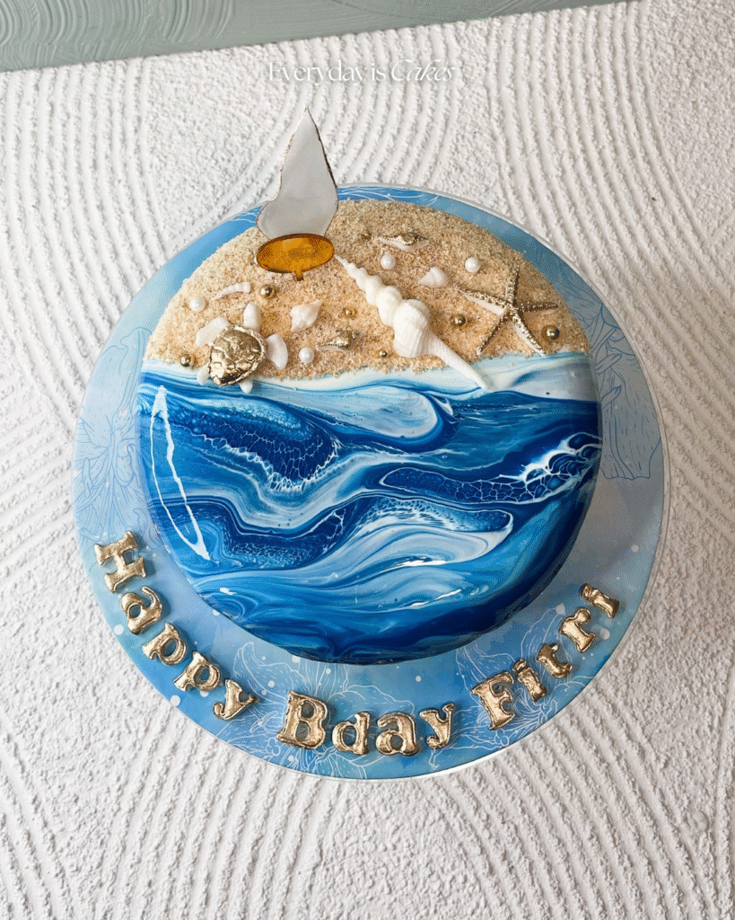 What Makes This Image Stand Out: The combination of marbled blue waves, intricate sand details, and the sailboat decoration creates a visually striking and elegant beach cake perfect for a memorable celebration.