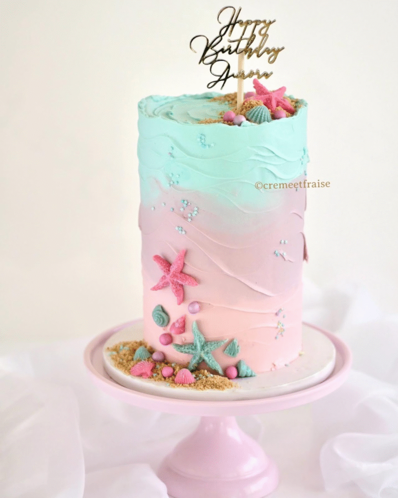 This beach-inspired cake is beautifully decorated with soft pastel colors, transitioning from pink to blue. The top is adorned with starfish, seashells, and colorful candies that bring a coastal touch to the design, perfect for a fun birthday celebration.