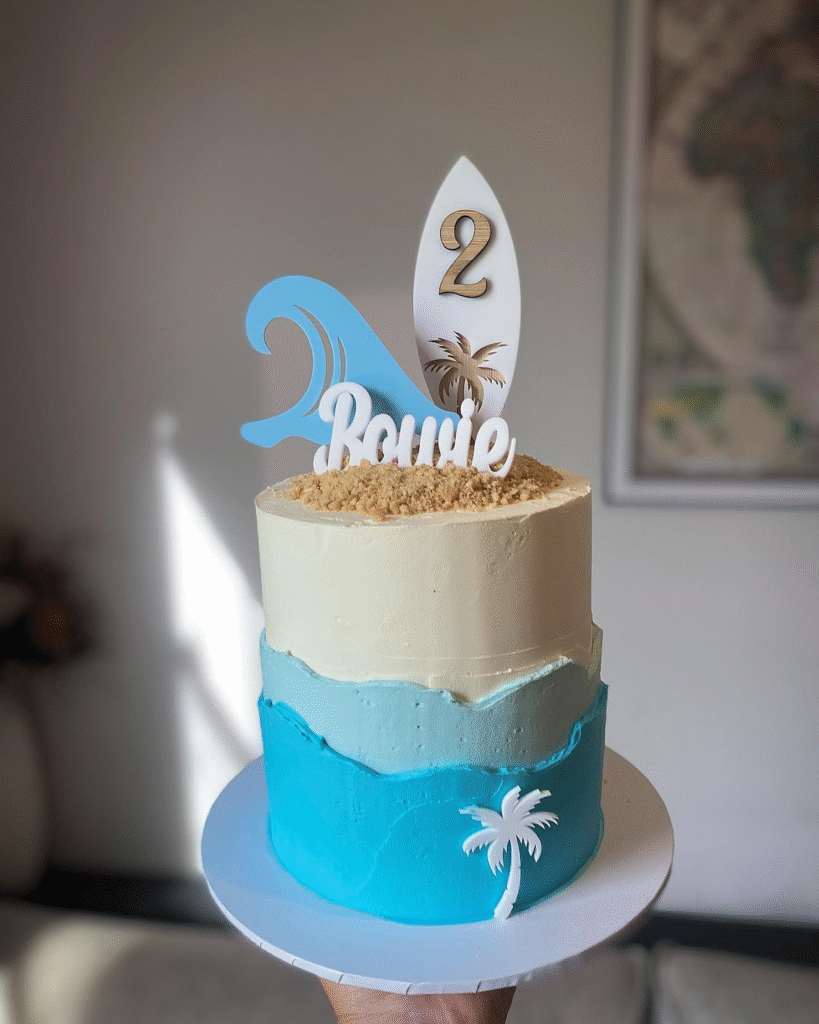 This beach-themed birthday cake features a beautiful ombre effect, transitioning from soft cream to pastel blue, with a vibrant ocean blue at the bottom. Topped with a fun surfboard decoration, personalized name “Bowie,” and a sandy texture, it captures the essence of a tropical beach party.