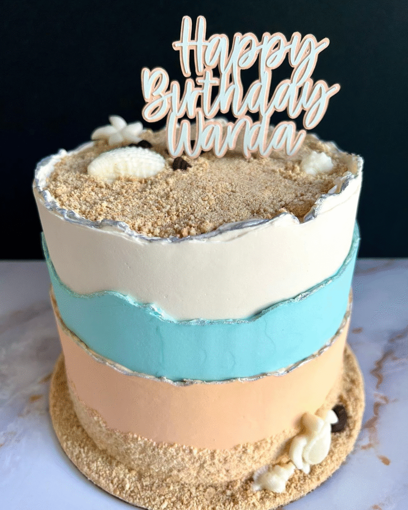The personalized “Happy Birthday Wanda” topper adds a special touch, making it perfect for a refined coastal-themed celebration. The subtle color palette and elegant simplicity make this cake ideal for anyone seeking a peaceful beach-inspired design for their special day.