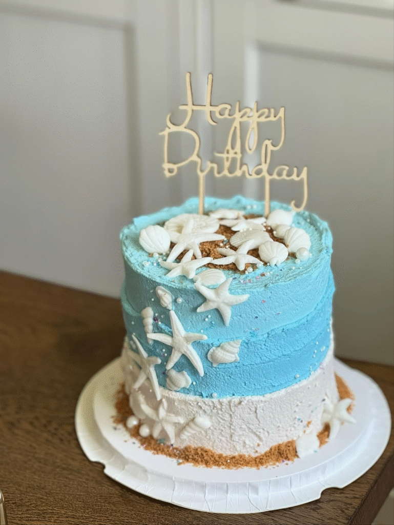 What Makes This Image Stand Out: The simple yet elegant beach decorations, combined with the ombre frosting and starfish, create a serene and fun atmosphere, making this cake perfect for a beach-themed birthday celebration.
