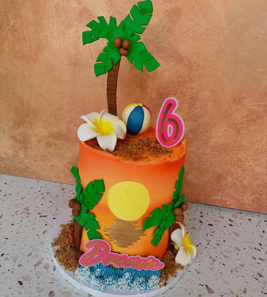 This charming birthday cake brings the beach to life with its vibrant orange sunset and fondant palm trees. The edible sand effect and a beach ball add playful touches, while the number “6” topper makes the cake special for a milestone birthday.