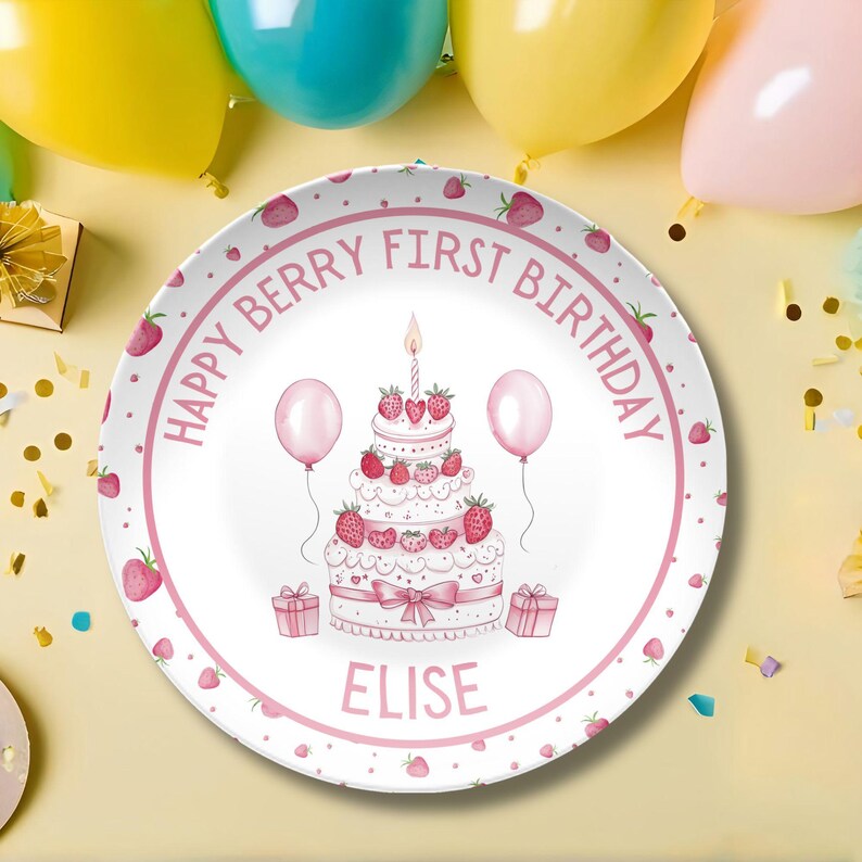 These strawberry-printed plates are the ideal addition to a berry-themed party. Featuring a cute birthday cake design, they’re perfect for serving up party snacks or desserts. The soft pink borders complement the overall theme, adding a touch of fun and charm to the table setting. These plates are both functional and adorable, making them a delightful choice for any berry-first birthday party.