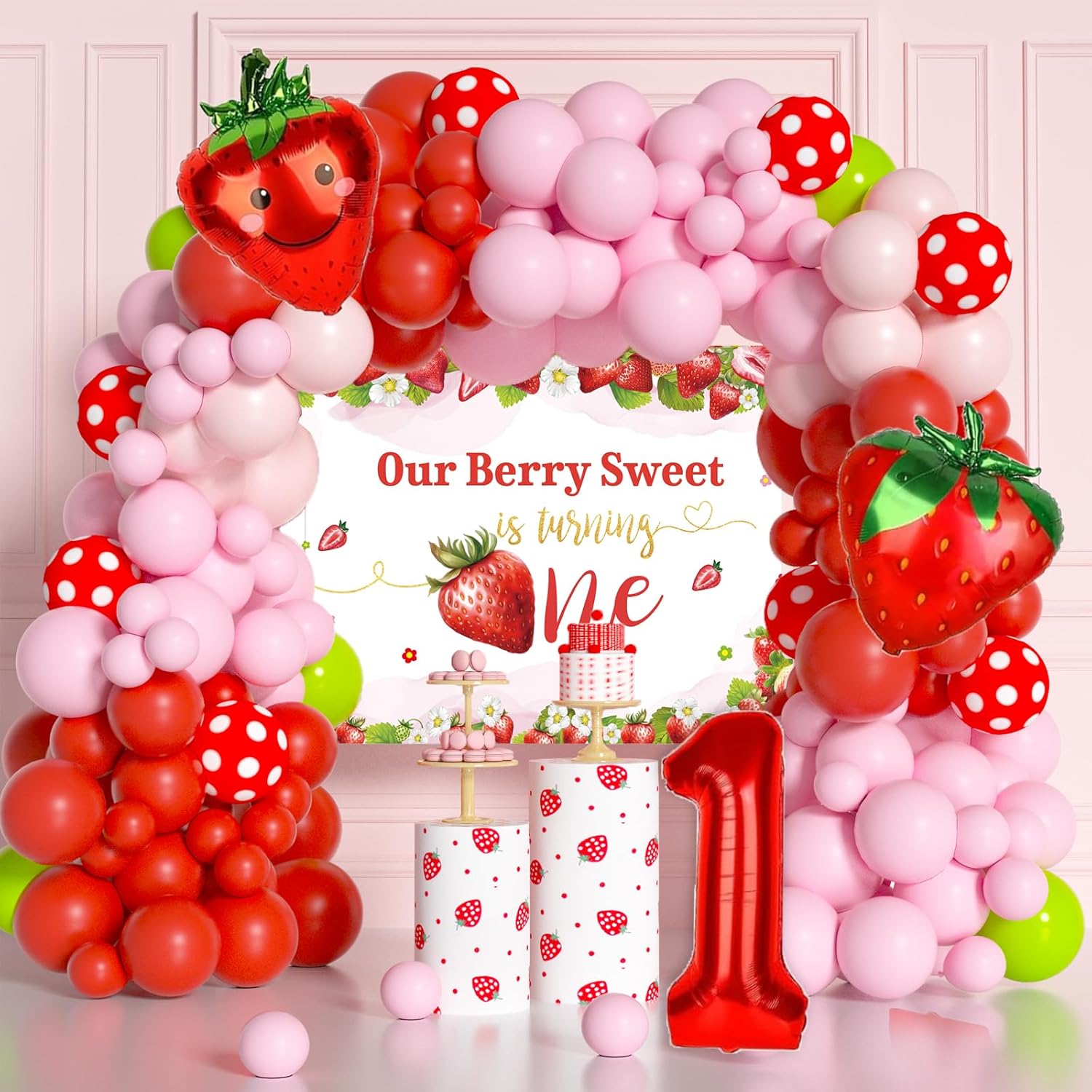 This stunning balloon arch creates a festive and welcoming atmosphere for the party. With bright red, pink, and green balloons, it resembles a beautiful strawberry garden. The “Our Berry Sweet is turning One” sign adds a personal touch, making it the perfect backdrop for photos. The whimsical strawberry-shaped balloons add to the charm, making this setup both playful and elegant a perfect introduction to a berry-filled first birthday celebration!