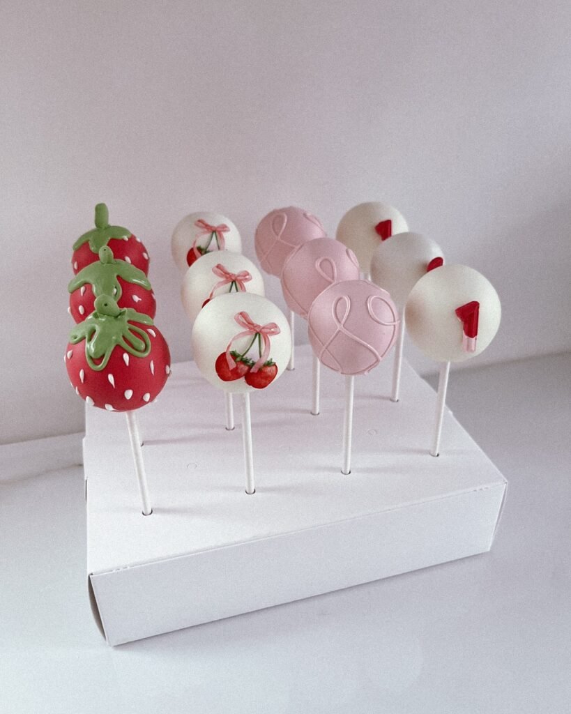 These berry-inspired cake pops are the perfect addition to any dessert table. The red and pink coatings, designed to look like strawberries, make these treats both delicious and visually stunning. The sweet, creamy center complements the soft, melt-in-your-mouth outer layer, while the delicate decorations, like the number “1,” tie them perfectly to the first birthday celebration. These cake pops are both adorable and scrumptious, making them a fun treat for all ages.