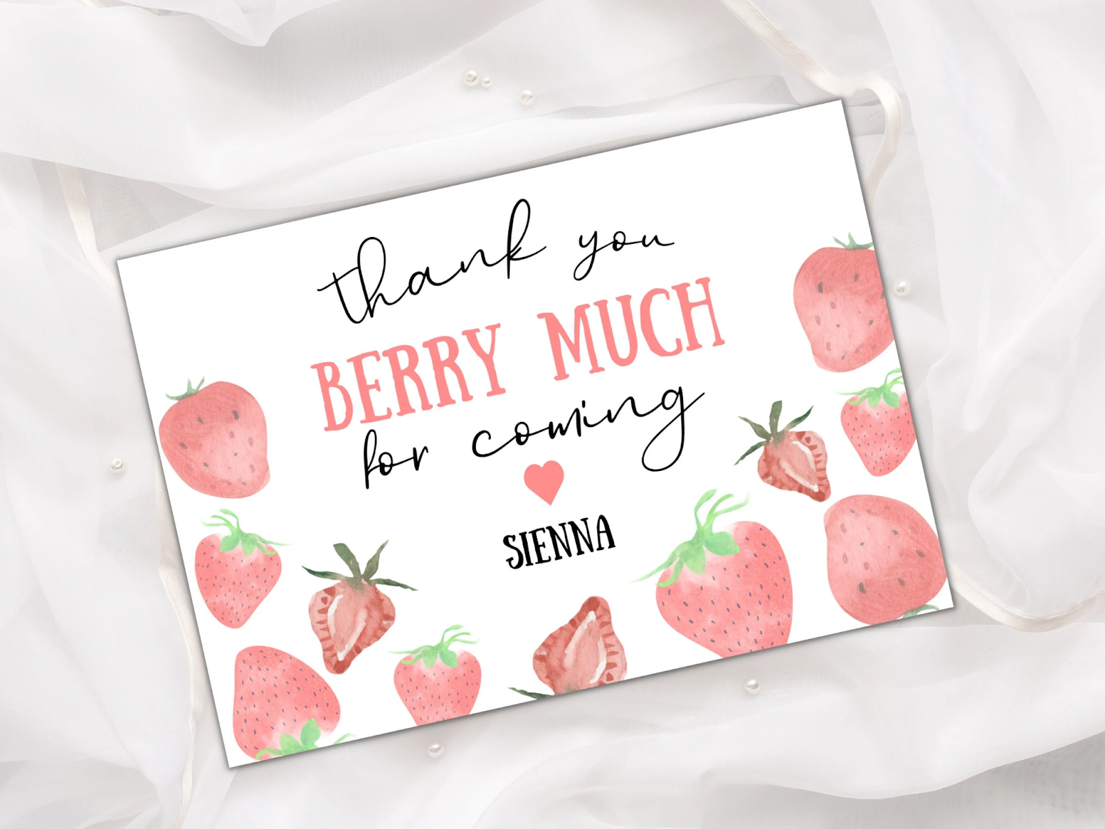 This thank-you card is a charming way to show appreciation for guests who attended the berry-themed birthday party. Adorned with watercolor strawberries, the card features the playful message “Thank you Berry Much for Coming” in soft pink and black script. It’s a simple yet thoughtful gesture that leaves a lasting impression, reminding guests of the sweet time they had while celebrating the little one’s milestone. The perfect closing touch to a berrylicious event!