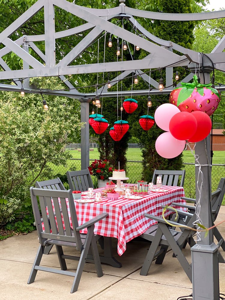 This berry-themed table setup epitomizes fun and charm! The hanging strawberry honeycomb decorations above the table complement the vibrant checkered tablecloth. Strawberry-adorned plates and bowls, with a beautiful cake topped with fresh berries at the center, set the stage for an unforgettable celebration. The inviting vibe and bright colors make this party table perfect for creating lasting memories at a first birthday celebration.