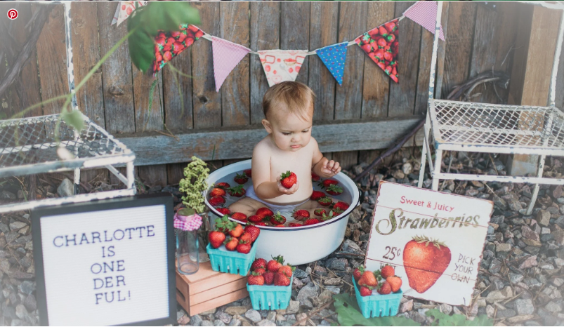 This adorable setup features the birthday boy enjoying his berry-themed bath surrounded by fresh strawberries and cute baskets. The rustic backdrop and playful signage make this moment even more special. The “Sweet & Juicy Strawberries” sign adds a charming touch, while the berry baskets and the vibrant colors create a fun and relaxed atmosphere. This delightful scene captures the joy of a first birthday, making it a perfect photo opportunity!