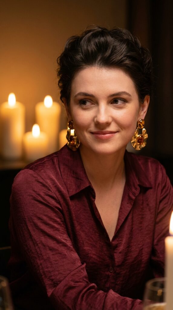 The real magic happens with your accessory statement. Choose bold gold hoops or chandelier earrings to frame your face. Silver works too, but gold amplifies burgundy’s warmth. Skip the necklace – let those earrings steal the spotlight while you celebrate in understated luxury.